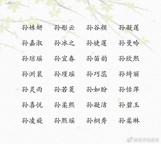 对于新生儿的命名,家长要慎重考虑,对命名过程进行详细研究,慎重选择。宝宝的名字可能会影响他/她的一生,所以家长在取名时要特别注意。一般来说,孙姓的男婴可以根据不同的拼音命名,如孙少华、孙健、孙晓明、孙道伟等;女婴可以用新鲜优雅的名字命名,如孙芳、孙梅、孙琴、孙宁等。